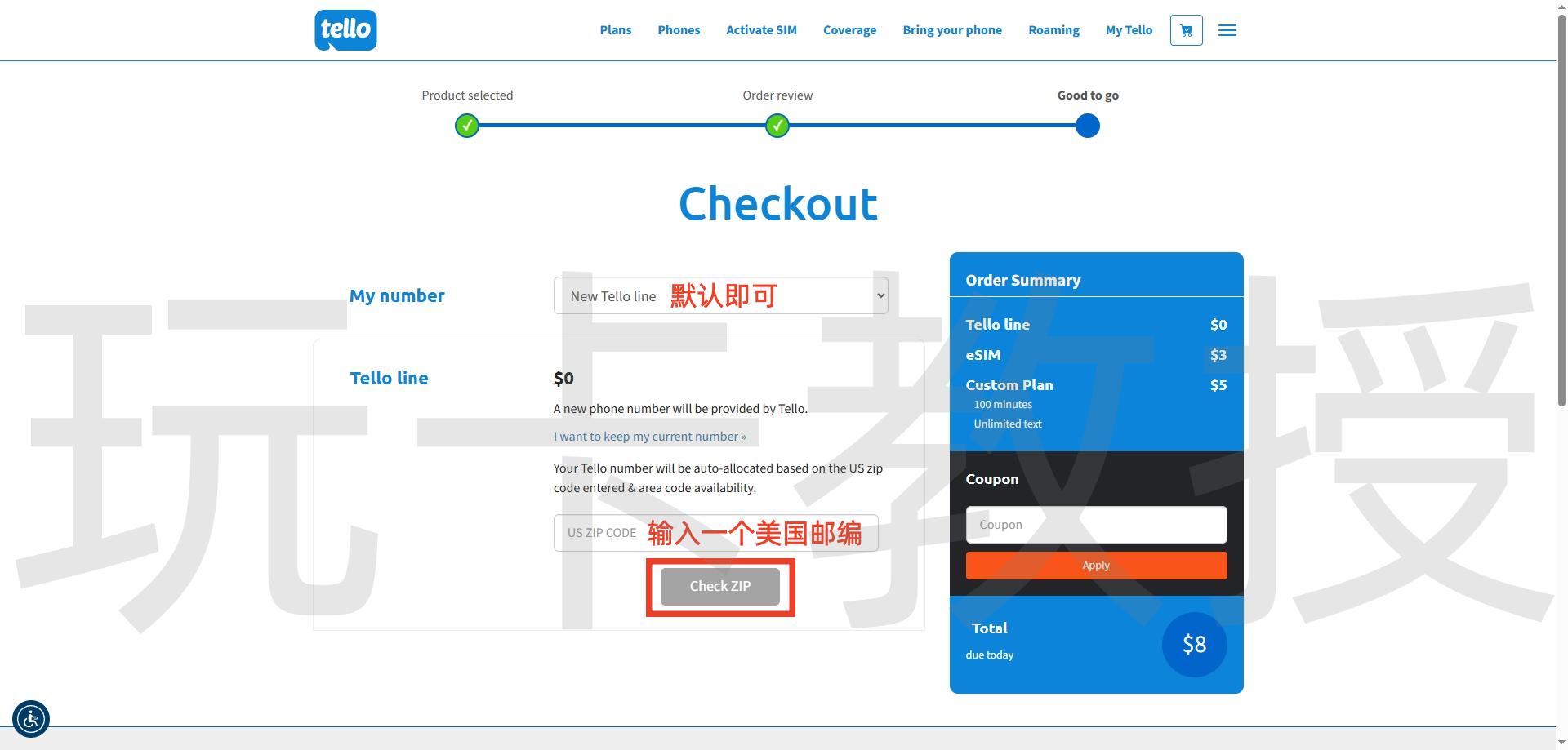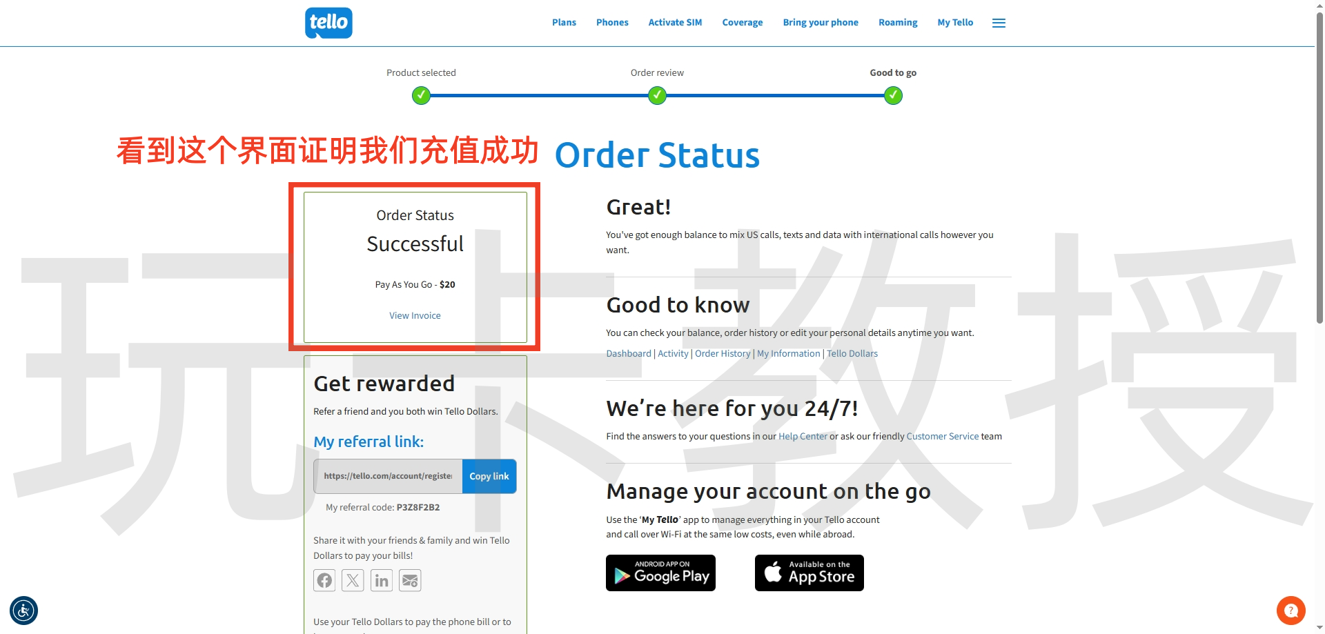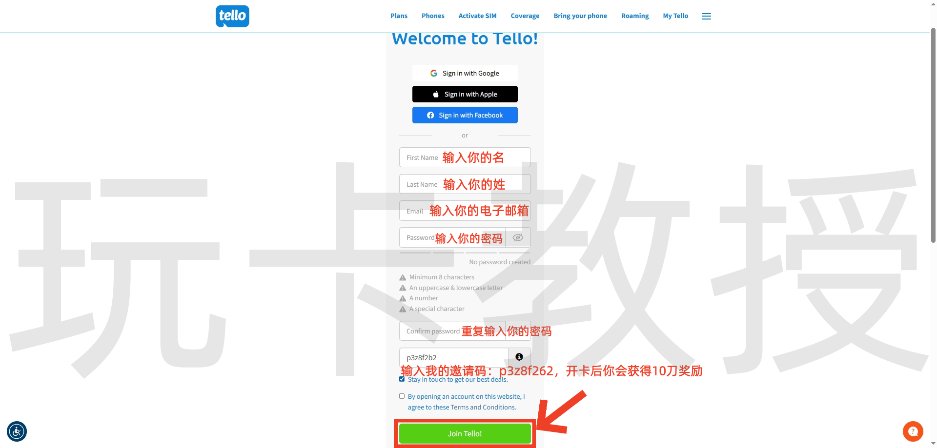 流量:1美分/MB 注:有月套餐状态下,Pay AS You GO的余额不会过期 开卡教程: 使用国内IP,不要使用代理打开这个链接(AFF):https://tello.com/account/register?_referral=P3Z8F2B2,输入你的姓,名,海外邮箱,密码,邀请码输入:P3Z8F2B2,开卡后你会获得10刀奖励,点击:Join Tello!,进行注册