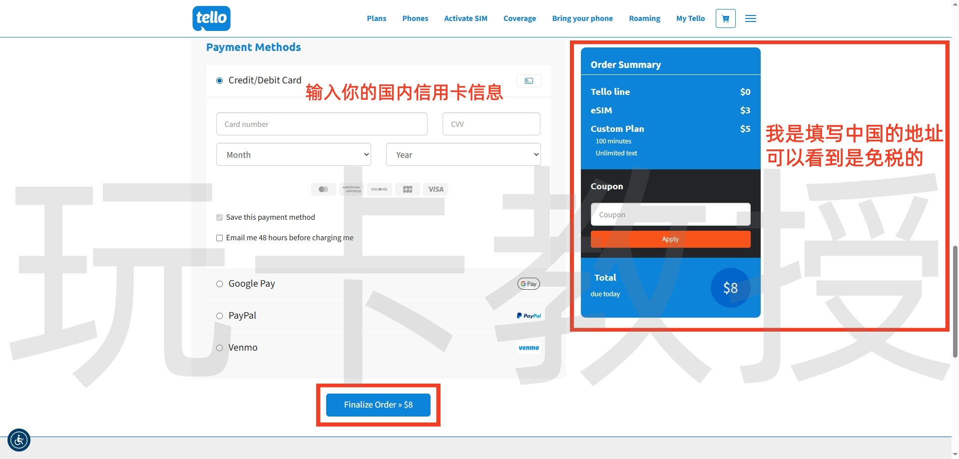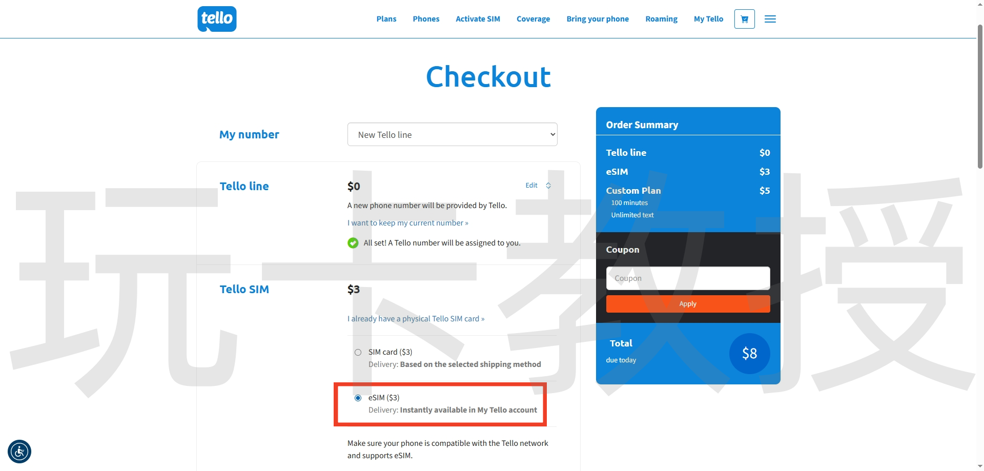 Tello Mobile是一家成立于2016年的美国移动虚拟网络运营商(MVNO),使用T-Mobile的网络提供服务。8美元开卡费,月租5美元,无需KYC,支持WiFi-Calling,可漫游中国移动/中国联通。 eSIM及漫游情况: