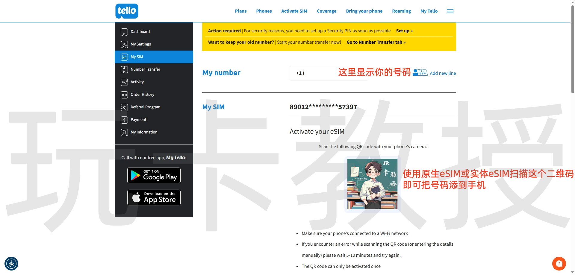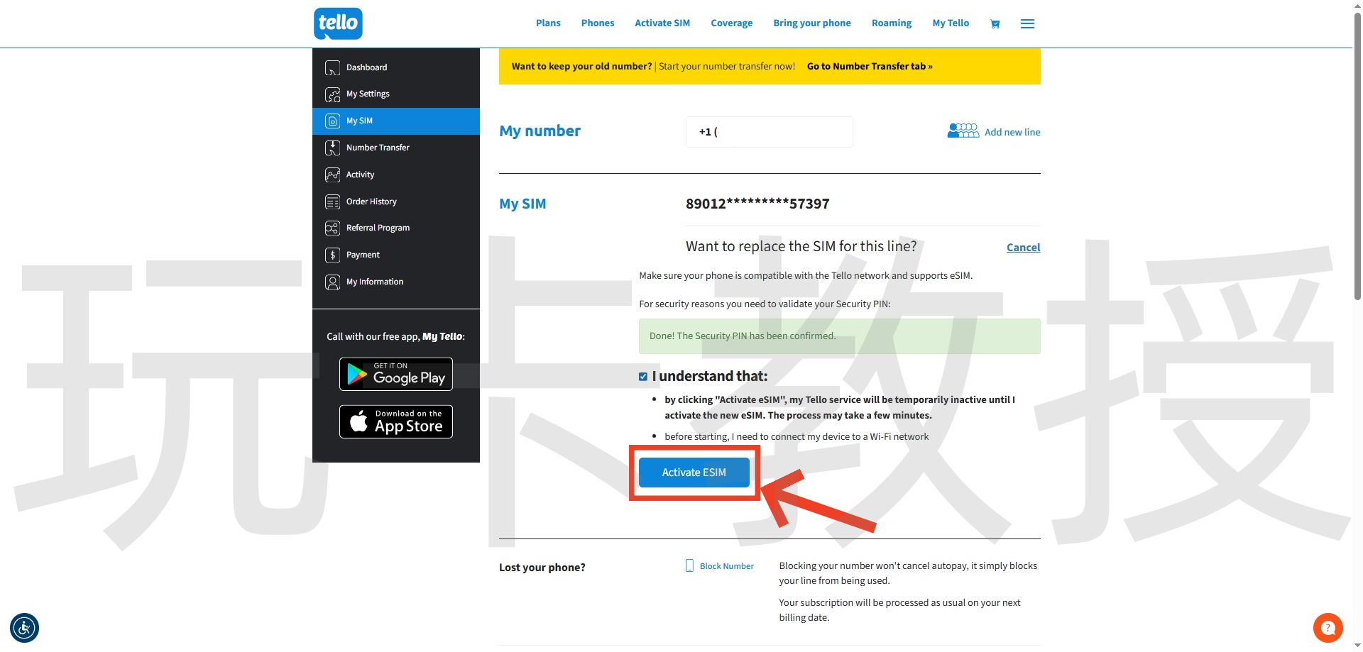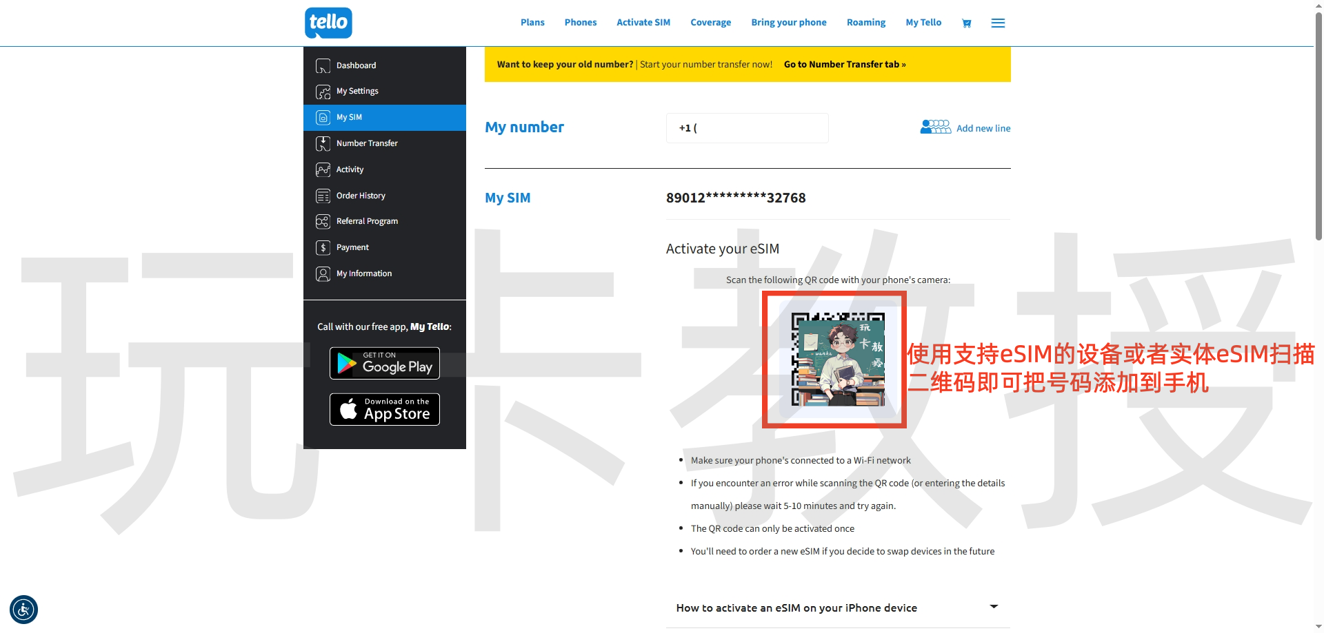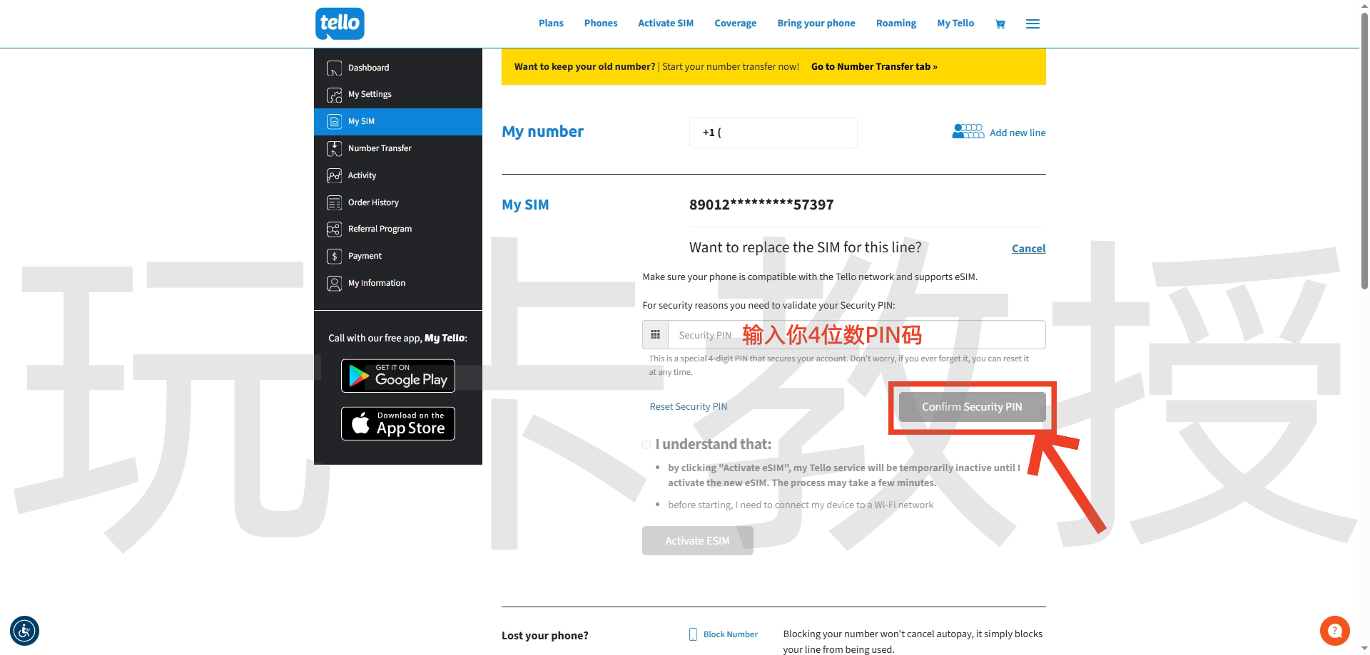 3.支持eSIM更换设备,原设备联网并删除后,在后台My Sim-ESIM-输入PIN-Activate ESlM生成新二维码(网页最多4-5次,超出要找客服拿新二维码)