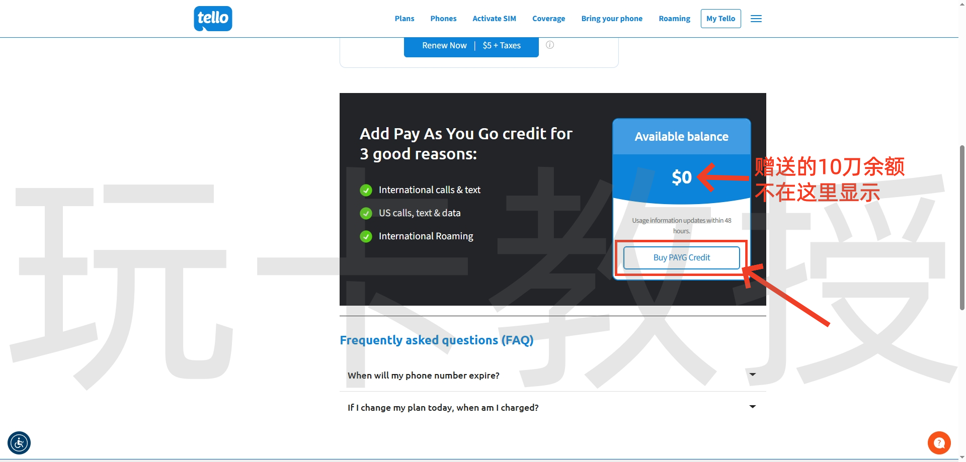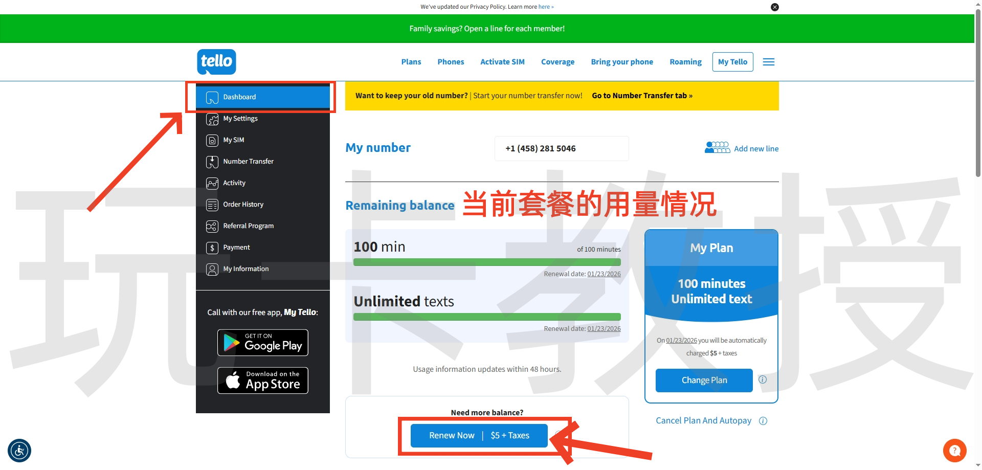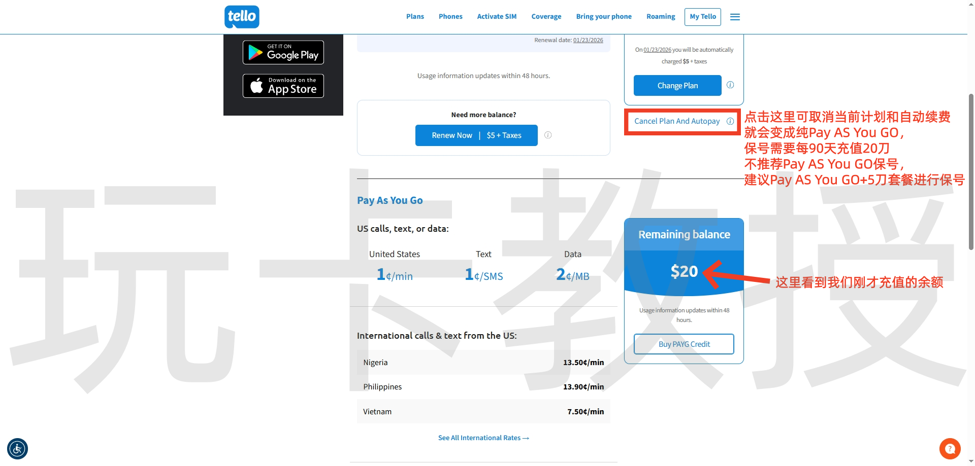 返回Tello后台,点击:Dashboard,往下拉就可以看到外面刚才充值的余额,点击:Cancel Plan And Autopay,可取消当前计划和自动续费就会变成仅Pay AS You GO,需要每90天充值20刀进行保号,充值的余额会在90天后过期,不推荐仅Pay AS You GO,建议Pay AS You GO+5刀套餐进行保号,这样我们的余额既不会过期,也可以漫游,同时可以享受Pay AS You GO的费用